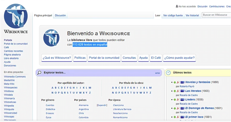 Wikisource.com no solo se centra en libros sino también en otro tipo de textos, y debemos mencionar que hasta hoy en día tiene un poco más de 120.000 ejemplares disponibles para obtener, un número que realmente llama la atención. También tiene un buscador muy intuitivo que nos permite encontrar rápidamente los ejemplares por la variable de género, o también escribiendo los nombres (ya sea del autor o del libro).